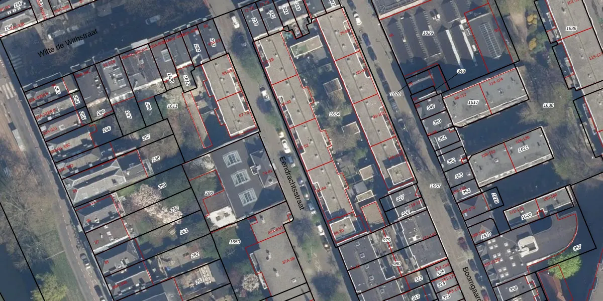 Eendrachtsstraat 46 is gelegen op kadastraal perceel RTD04AG1614. Deze kadastrale aanduiding is uniek en wordt gebruikt door het Kadaster om eigendomsrechten en andere zakelijke rechten vast te leggen. Het perceel maakt onderdeel uit van de kadastrale gemeente Rotterdam.