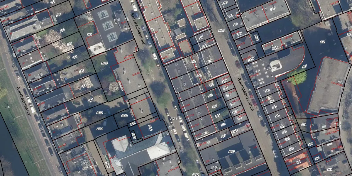 Eendrachtsstraat 90 is gelegen op kadastraal perceel RTD04AG980. Deze kadastrale aanduiding is uniek en wordt gebruikt door het Kadaster om eigendomsrechten en andere zakelijke rechten vast te leggen. Het perceel maakt onderdeel uit van de kadastrale gemeente Rotterdam.