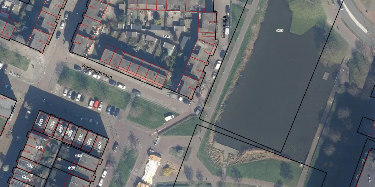 Het perceel waarop Eikenpage 43 staat heeft een oppervlakte van 3320 m². Dit is een zeer groot perceel. De perceeloppervlakte wordt geregistreerd door het Kadaster. Gedetailleerde informatie over de maten van dit perceel kunt u vinden in het rapport Kadastrale kaart met maatvoering van Eikenpage 43.