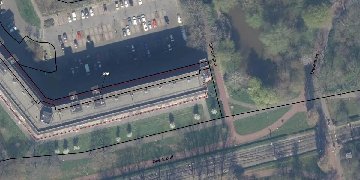 Het perceel waarop Einsteinplaats 1041 staat heeft een oppervlakte van 1,1 ha. Dit is een zeer groot perceel. De perceeloppervlakte wordt geregistreerd door het Kadaster. Gedetailleerde informatie over de maten van dit perceel kunt u vinden in het rapport Kadastrale kaart met maatvoering van Einsteinplaats 1041.