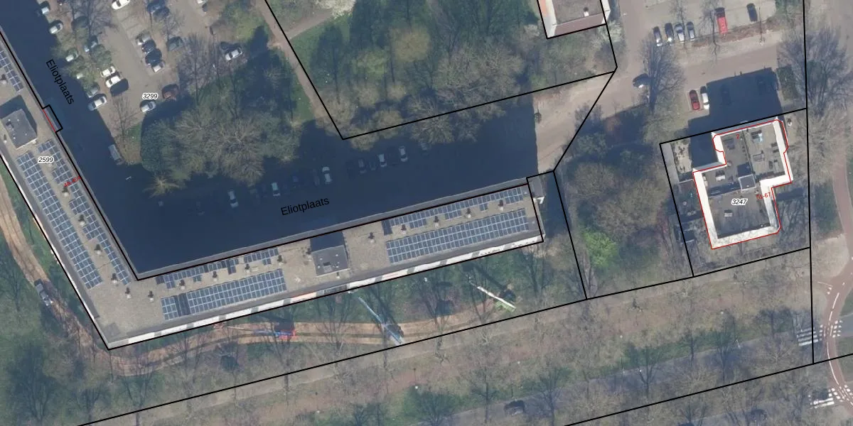 Het perceel waarop Eliotplaats 20 staat heeft een oppervlakte van 2710 m². Dit is een zeer groot perceel. De perceeloppervlakte wordt geregistreerd door het Kadaster. Gedetailleerde informatie over de maten van dit perceel kunt u vinden in het rapport Kadastrale kaart met maatvoering van Eliotplaats 20.