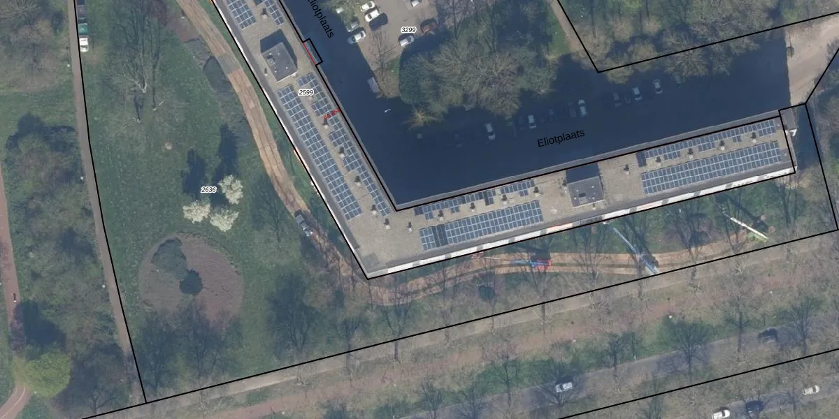 Het perceel waarop Eliotplaats 250 staat heeft een oppervlakte van 2710 m². Dit is een zeer groot perceel. De perceeloppervlakte wordt geregistreerd door het Kadaster. Gedetailleerde informatie over de maten van dit perceel kunt u vinden in het rapport Kadastrale kaart met maatvoering van Eliotplaats 250.