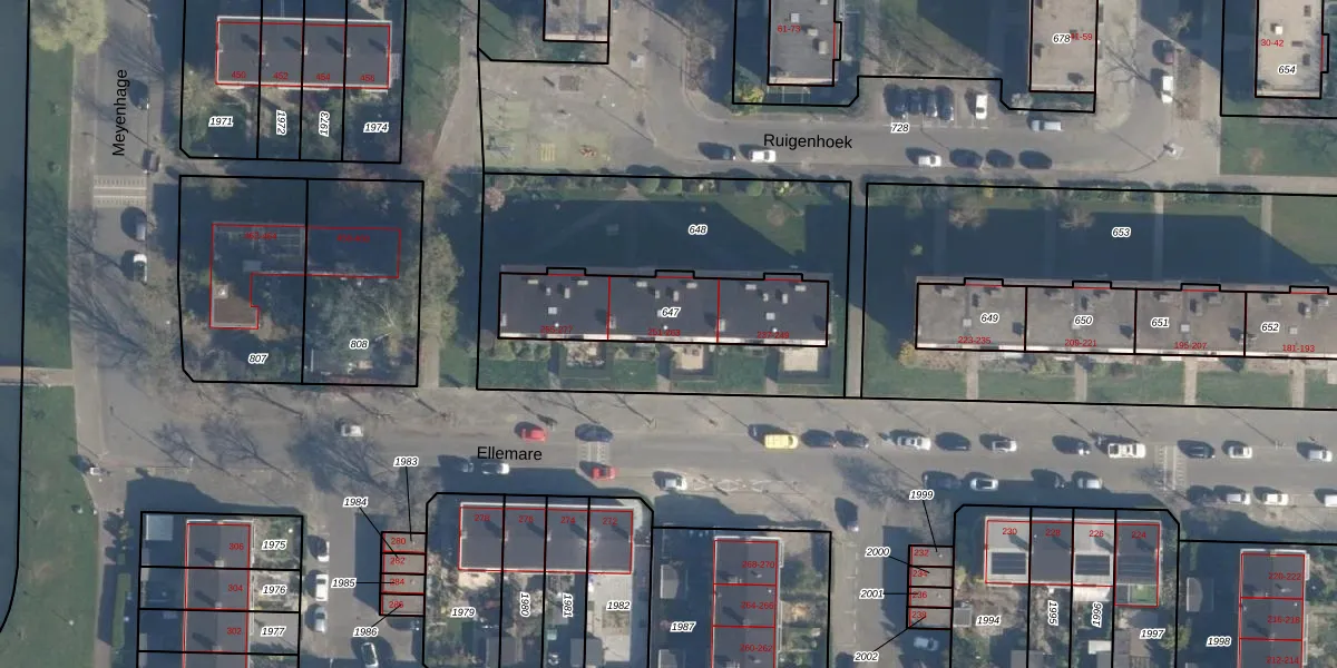 Het perceel waarop Ellemare 255 staat heeft een oppervlakte van 494 m². Dit is een groot perceel. De perceeloppervlakte wordt geregistreerd door het Kadaster. Gedetailleerde informatie over de maten van dit perceel kunt u vinden in het rapport Kadastrale kaart met maatvoering van Ellemare 255.