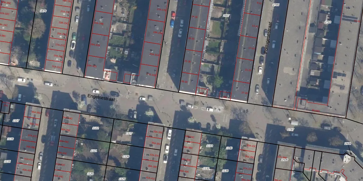 Engelsestraat 103 is gelegen op kadastraal perceel RTD10AA2557. Deze kadastrale aanduiding is uniek en wordt gebruikt door het Kadaster om eigendomsrechten en andere zakelijke rechten vast te leggen. Het perceel maakt onderdeel uit van de kadastrale gemeente Rotterdam.