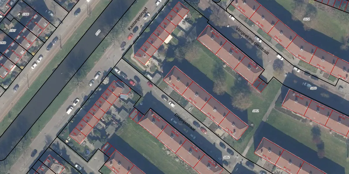 Het perceel waarop Ereprijsstraat 31-C staat heeft een oppervlakte van 6944 m². Dit is een zeer groot perceel. De perceeloppervlakte wordt geregistreerd door het Kadaster. Gedetailleerde informatie over de maten van dit perceel kunt u vinden in het rapport Kadastrale kaart met maatvoering van Ereprijsstraat 31-C.