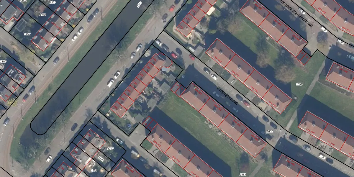 Het perceel waarop Ereprijsstraat 36 staat heeft een oppervlakte van 7167 m². Dit is een zeer groot perceel. De perceeloppervlakte wordt geregistreerd door het Kadaster. Gedetailleerde informatie over de maten van dit perceel kunt u vinden in het rapport Kadastrale kaart met maatvoering van Ereprijsstraat 36.