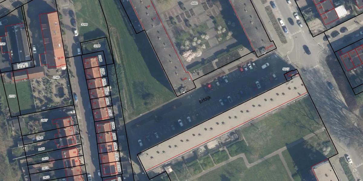 Het perceel waarop Erfdijk 39 staat heeft een oppervlakte van 4449 m². Dit is een zeer groot perceel. De perceeloppervlakte wordt geregistreerd door het Kadaster. Gedetailleerde informatie over de maten van dit perceel kunt u vinden in het rapport Kadastrale kaart met maatvoering van Erfdijk 39.