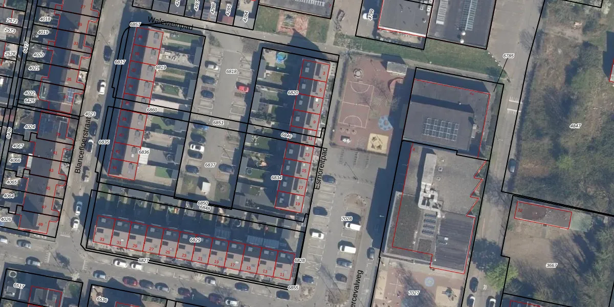 Het perceel waarop Esmoreitpad 13 staat heeft een oppervlakte van 623 m². Dit is een groot perceel. De perceeloppervlakte wordt geregistreerd door het Kadaster. Gedetailleerde informatie over de maten van dit perceel kunt u vinden in het rapport Kadastrale kaart met maatvoering van Esmoreitpad 13.