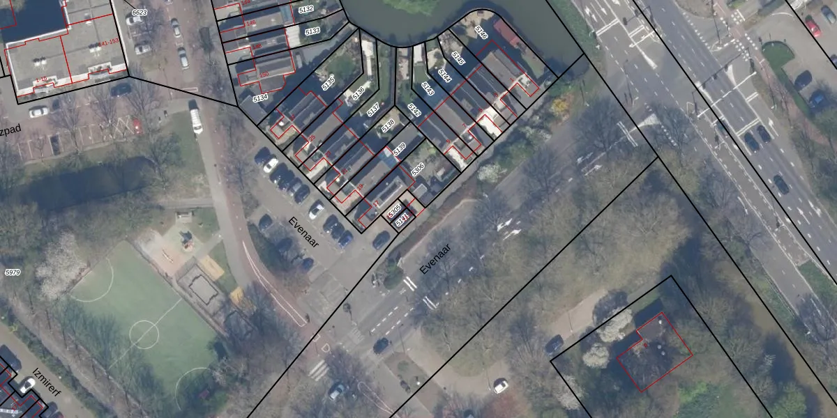 Het perceel waarop Evenaar 11 staat heeft een oppervlakte van 7616 m². Dit is een zeer groot perceel. De perceeloppervlakte wordt geregistreerd door het Kadaster. Gedetailleerde informatie over de maten van dit perceel kunt u vinden in het rapport Kadastrale kaart met maatvoering van Evenaar 11.