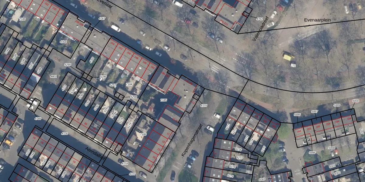 Het perceel waarop Evenaar 184 staat heeft een oppervlakte van 745 m². Dit is een groot perceel. De perceeloppervlakte wordt geregistreerd door het Kadaster. Gedetailleerde informatie over de maten van dit perceel kunt u vinden in het rapport Kadastrale kaart met maatvoering van Evenaar 184.