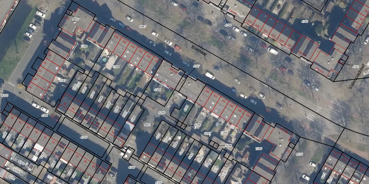 Het perceel waarop Evenaar 212 staat heeft een oppervlakte van 197 m². Dit is een middelgroot perceel. De perceeloppervlakte wordt geregistreerd door het Kadaster. Gedetailleerde informatie over de maten van dit perceel kunt u vinden in het rapport Kadastrale kaart met maatvoering van Evenaar 212.