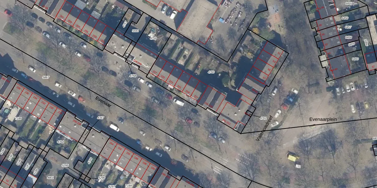 Het perceel waarop Evenaar 219 staat heeft een oppervlakte van 2184 m². Dit is een zeer groot perceel. De perceeloppervlakte wordt geregistreerd door het Kadaster. Gedetailleerde informatie over de maten van dit perceel kunt u vinden in het rapport Kadastrale kaart met maatvoering van Evenaar 219.