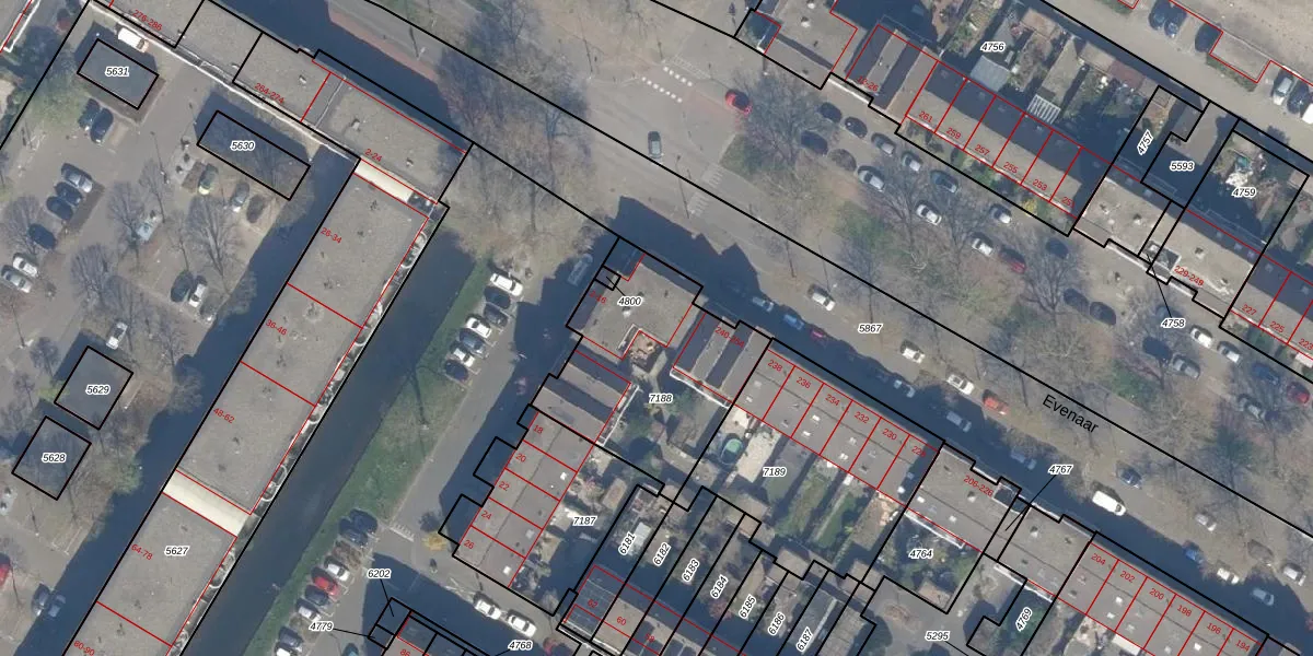 Het perceel waarop Evenaar 252 staat heeft een oppervlakte van 735 m². Dit is een groot perceel. De perceeloppervlakte wordt geregistreerd door het Kadaster. Gedetailleerde informatie over de maten van dit perceel kunt u vinden in het rapport Kadastrale kaart met maatvoering van Evenaar 252.