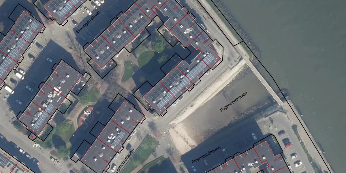 Het perceel waarop Feijenoordhaven 27 staat heeft een oppervlakte van 2496 m². Dit is een zeer groot perceel. De perceeloppervlakte wordt geregistreerd door het Kadaster. Gedetailleerde informatie over de maten van dit perceel kunt u vinden in het rapport Kadastrale kaart met maatvoering van Feijenoordhaven 27.