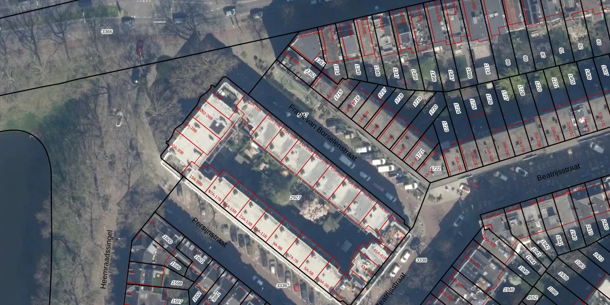 Het perceel waarop Frank van Borselenstraat 14-A staat heeft een oppervlakte van 2714 m². Dit is een zeer groot perceel. De perceeloppervlakte wordt geregistreerd door het Kadaster. Gedetailleerde informatie over de maten van dit perceel kunt u vinden in het rapport Kadastrale kaart met maatvoering van Frank van Borselenstraat 14-A.