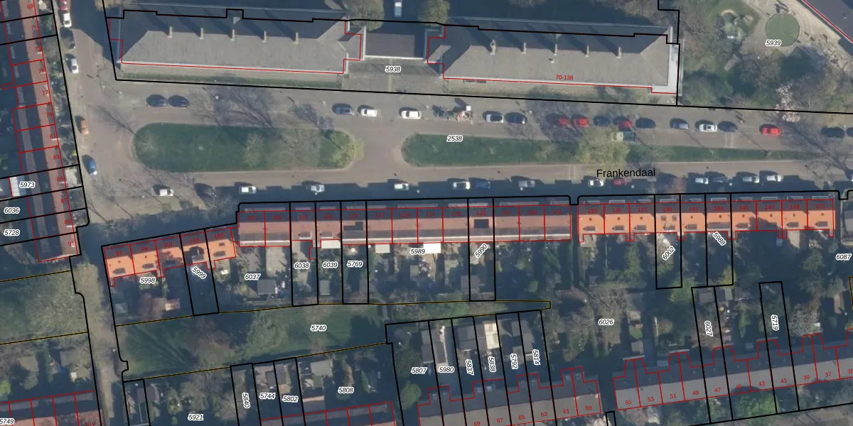 Het perceel waarop Frankendaal 121 staat heeft een oppervlakte van 586 m². Dit is een groot perceel. De perceeloppervlakte wordt geregistreerd door het Kadaster. Gedetailleerde informatie over de maten van dit perceel kunt u vinden in het rapport Kadastrale kaart met maatvoering van Frankendaal 121.