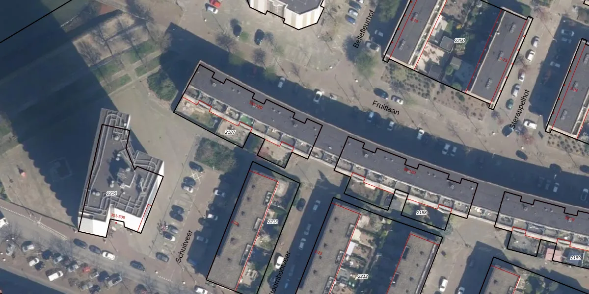 Fruitlaan 134 is gelegen op kadastraal perceel RTD05P2187. Deze kadastrale aanduiding is uniek en wordt gebruikt door het Kadaster om eigendomsrechten en andere zakelijke rechten vast te leggen. Het perceel maakt onderdeel uit van de kadastrale gemeente Rotterdam.