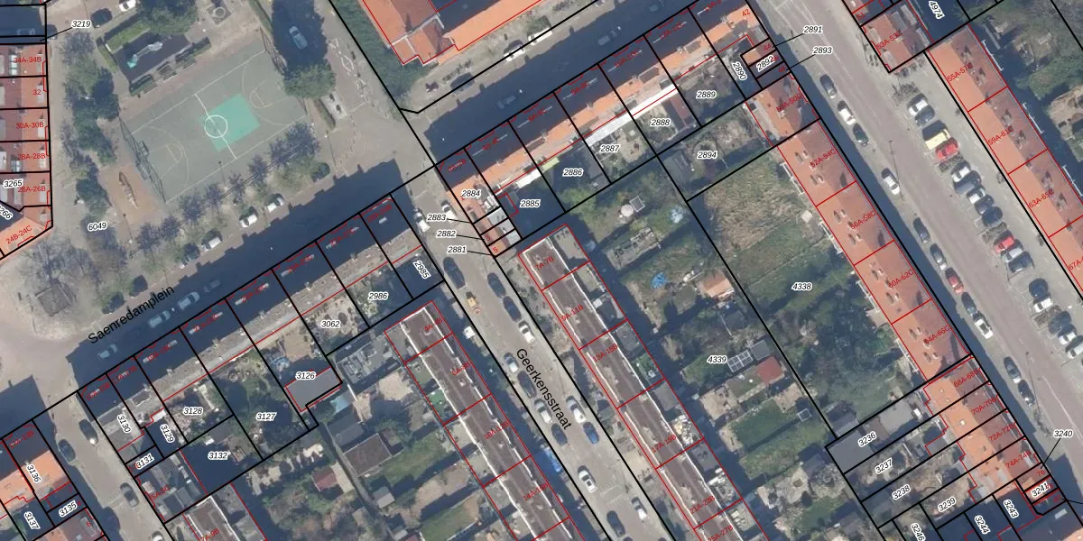 Het perceel waarop Geerkensstraat 7-B staat heeft een oppervlakte van 2960 m². Dit is een zeer groot perceel. De perceeloppervlakte wordt geregistreerd door het Kadaster. Gedetailleerde informatie over de maten van dit perceel kunt u vinden in het rapport Kadastrale kaart met maatvoering van Geerkensstraat 7-B.