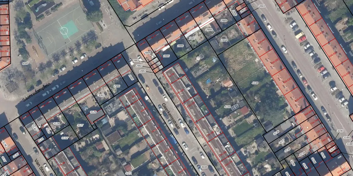 Het perceel waarop Geerkensstraat 9-B staat heeft een oppervlakte van 2960 m². Dit is een zeer groot perceel. De perceeloppervlakte wordt geregistreerd door het Kadaster. Gedetailleerde informatie over de maten van dit perceel kunt u vinden in het rapport Kadastrale kaart met maatvoering van Geerkensstraat 9-B.