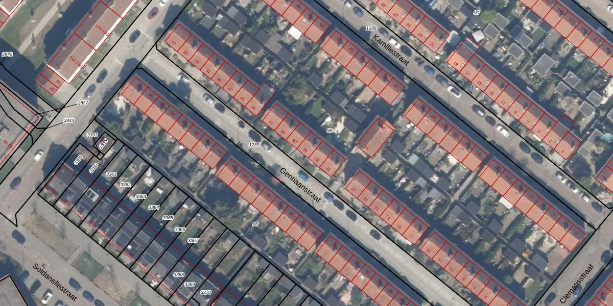 Het perceel waarop Gentiaanstraat 35 staat heeft een oppervlakte van 6743 m². Dit is een zeer groot perceel. De perceeloppervlakte wordt geregistreerd door het Kadaster. Gedetailleerde informatie over de maten van dit perceel kunt u vinden in het rapport Kadastrale kaart met maatvoering van Gentiaanstraat 35.