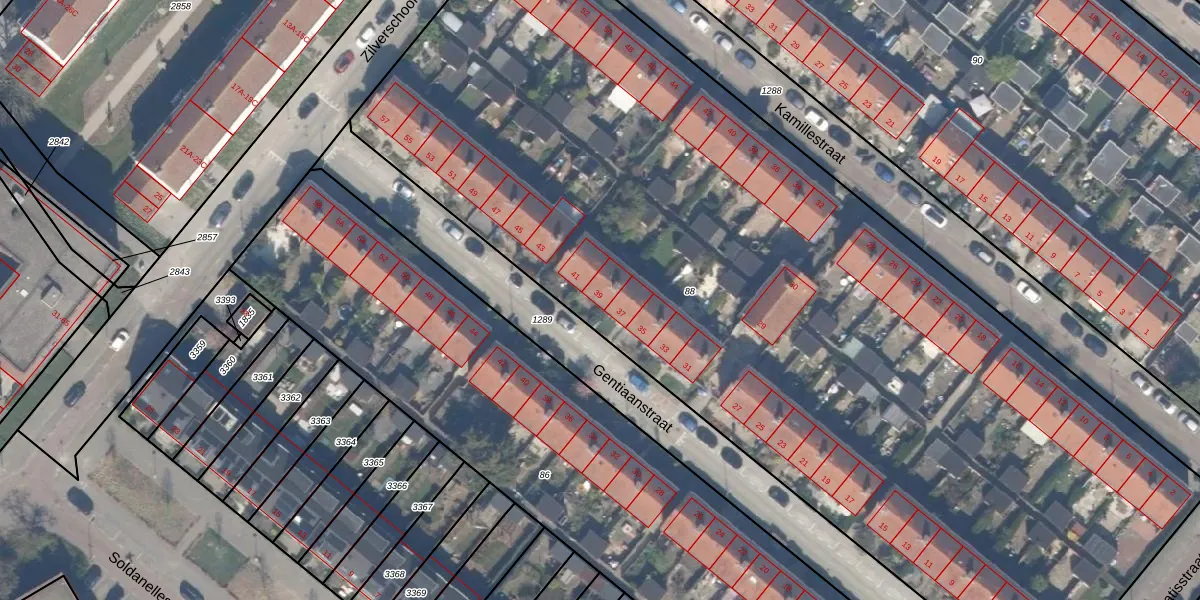 Het perceel waarop Gentiaanstraat 39 staat heeft een oppervlakte van 6743 m². Dit is een zeer groot perceel. De perceeloppervlakte wordt geregistreerd door het Kadaster. Gedetailleerde informatie over de maten van dit perceel kunt u vinden in het rapport Kadastrale kaart met maatvoering van Gentiaanstraat 39.
