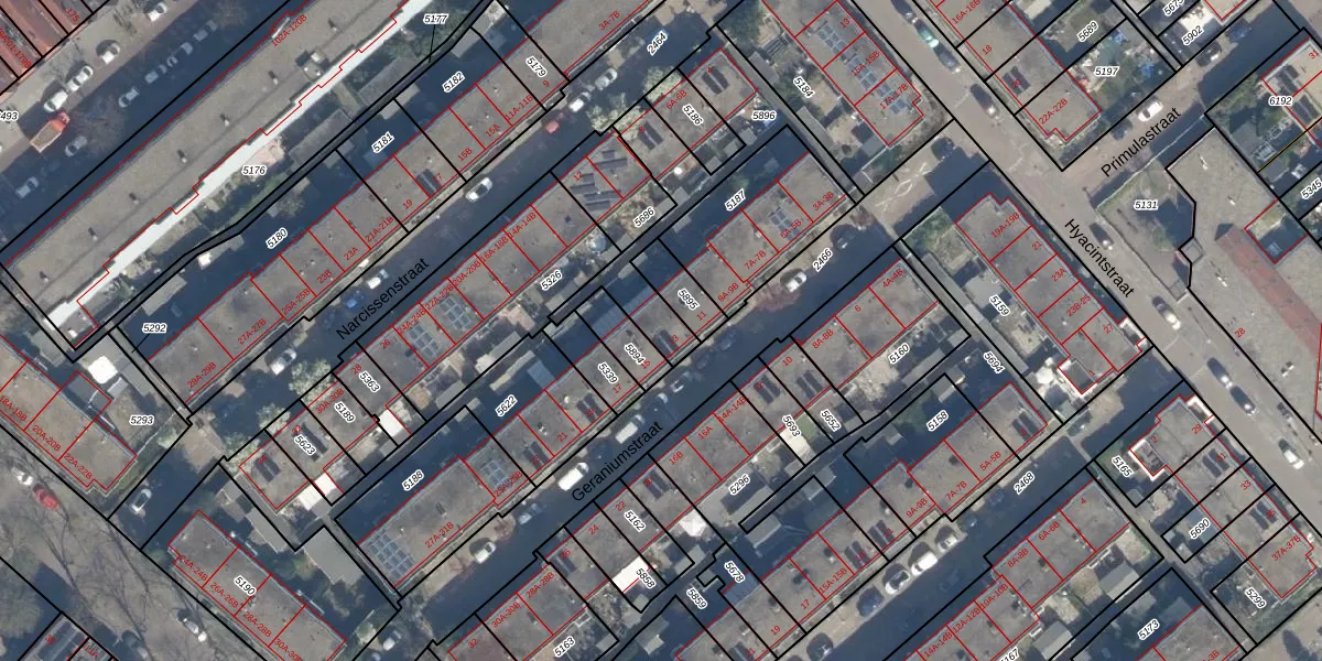 Geraniumstraat 13 is gelegen op kadastraal perceel CLS00G5896. Deze kadastrale aanduiding is uniek en wordt gebruikt door het Kadaster om eigendomsrechten en andere zakelijke rechten vast te leggen. Het perceel maakt onderdeel uit van de kadastrale gemeente Charlois.