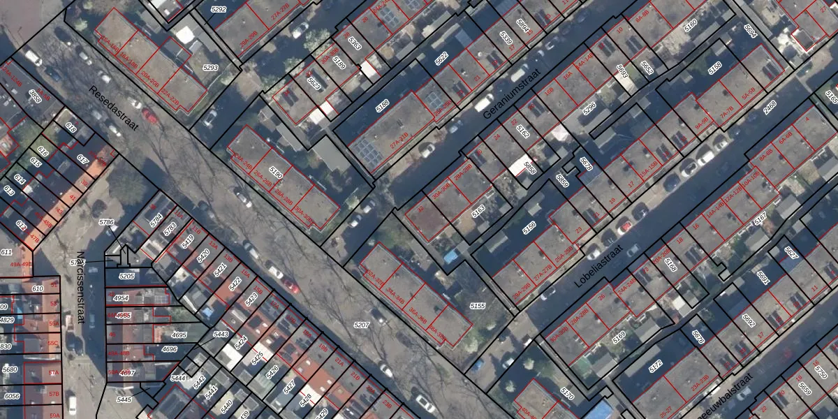 Geraniumstraat 32 is gelegen op kadastraal perceel CLS00G5859. Deze kadastrale aanduiding is uniek en wordt gebruikt door het Kadaster om eigendomsrechten en andere zakelijke rechten vast te leggen. Het perceel maakt onderdeel uit van de kadastrale gemeente Charlois.