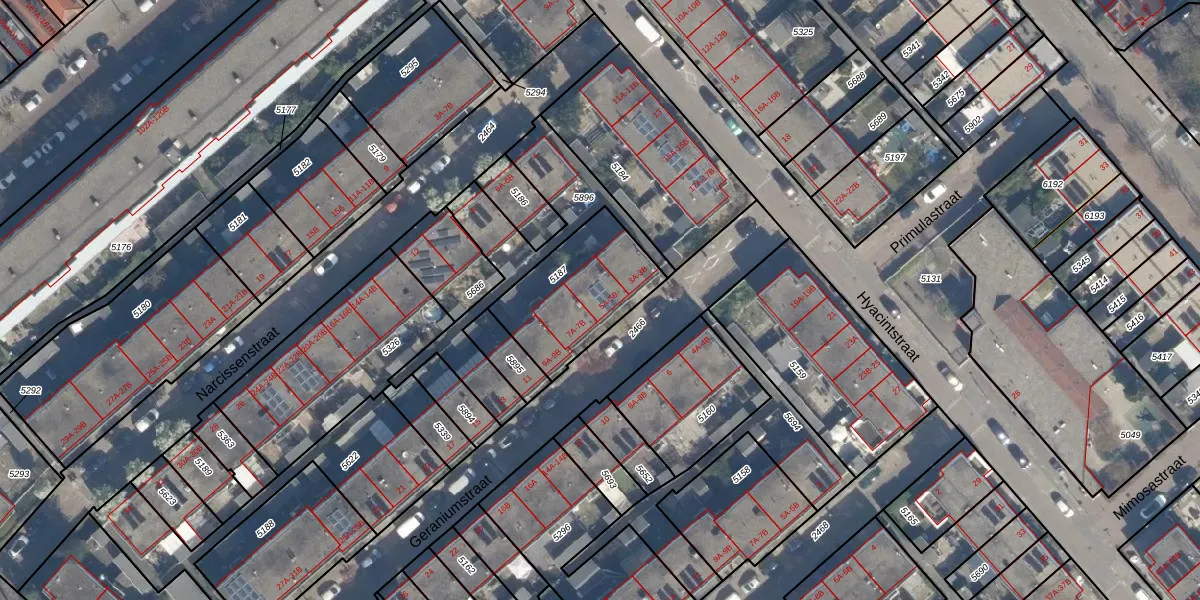 Geraniumstraat 5-B is gelegen op kadastraal perceel CLS00G5187. Deze kadastrale aanduiding is uniek en wordt gebruikt door het Kadaster om eigendomsrechten en andere zakelijke rechten vast te leggen. Het perceel maakt onderdeel uit van de kadastrale gemeente Charlois.