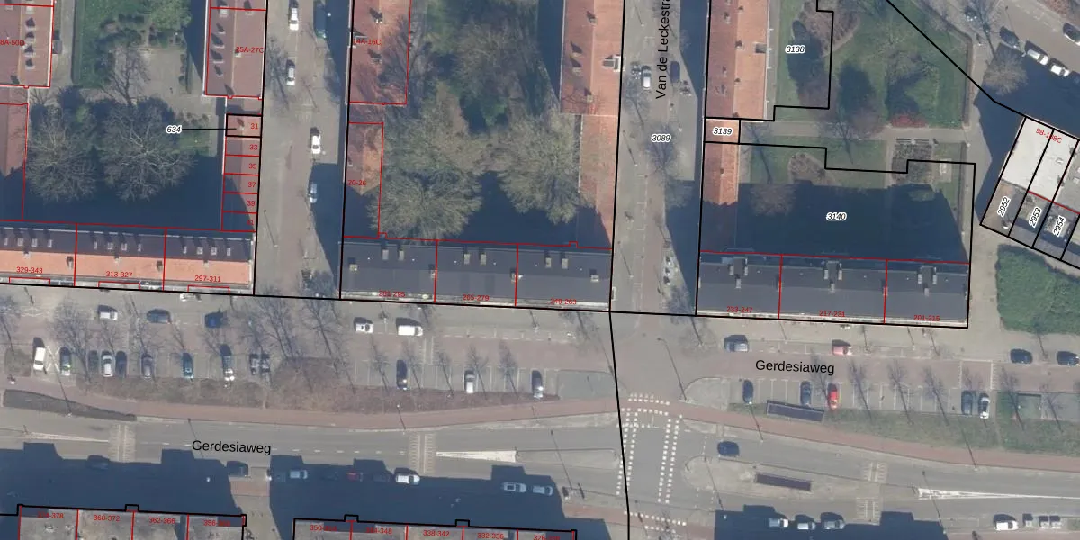 Gerdesiaweg 287 is gelegen op kadastraal perceel RTD04AE493. Deze kadastrale aanduiding is uniek en wordt gebruikt door het Kadaster om eigendomsrechten en andere zakelijke rechten vast te leggen. Het perceel maakt onderdeel uit van de kadastrale gemeente Rotterdam.