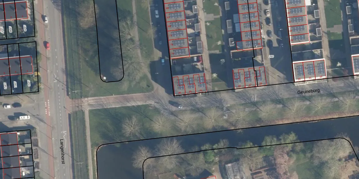 Het perceel waarop Geuneburg 35 staat heeft een oppervlakte van 5054 m². Dit is een zeer groot perceel. De perceeloppervlakte wordt geregistreerd door het Kadaster. Gedetailleerde informatie over de maten van dit perceel kunt u vinden in het rapport Kadastrale kaart met maatvoering van Geuneburg 35.