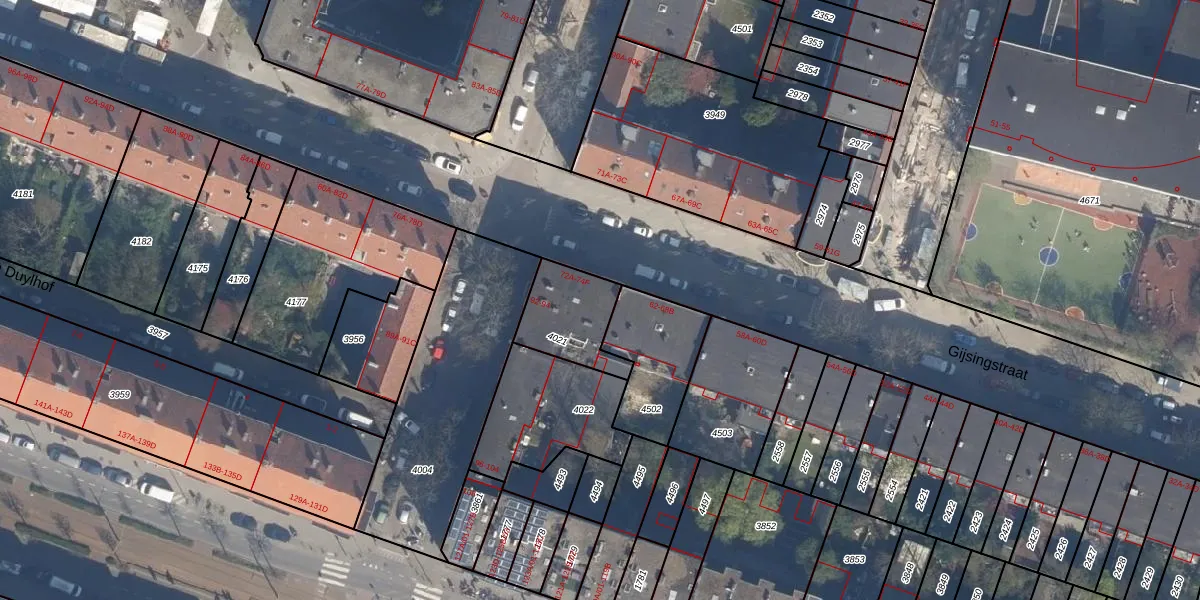 Het perceel waarop Gijsingstraat 72-A staat heeft een oppervlakte van 234 m². Dit is een middelgroot perceel. De perceeloppervlakte wordt geregistreerd door het Kadaster. Gedetailleerde informatie over de maten van dit perceel kunt u vinden in het rapport Kadastrale kaart met maatvoering van Gijsingstraat 72-A.