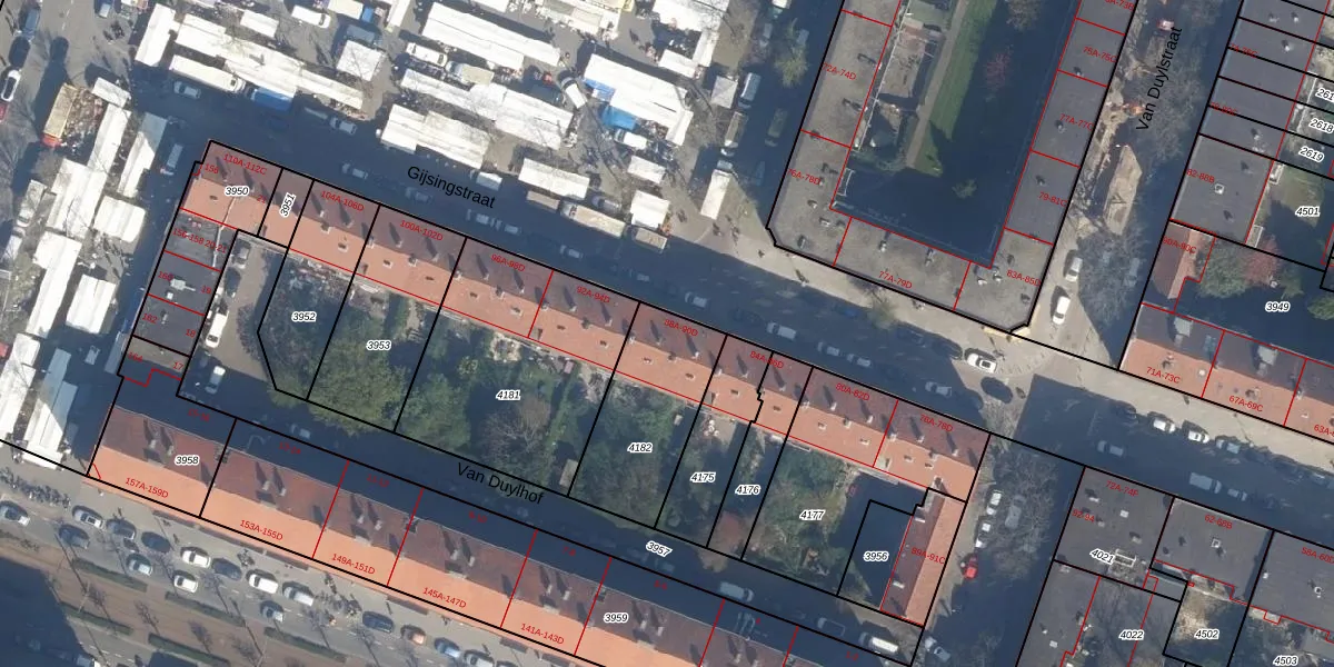 Het perceel waarop Gijsingstraat 90-D staat heeft een oppervlakte van 428 m². Dit is een groot perceel. De perceeloppervlakte wordt geregistreerd door het Kadaster. Gedetailleerde informatie over de maten van dit perceel kunt u vinden in het rapport Kadastrale kaart met maatvoering van Gijsingstraat 90-D.