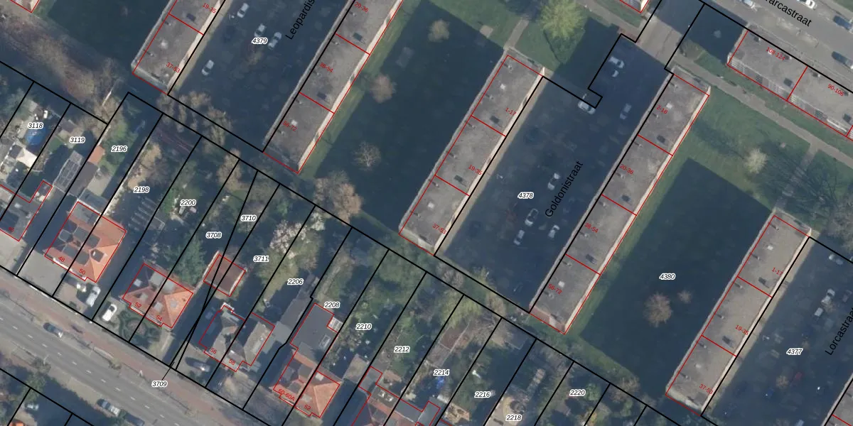 Het perceel waarop Goldonistraat 39 staat heeft een oppervlakte van 1,9 ha. Dit is een zeer groot perceel. De perceeloppervlakte wordt geregistreerd door het Kadaster. Gedetailleerde informatie over de maten van dit perceel kunt u vinden in het rapport Kadastrale kaart met maatvoering van Goldonistraat 39.