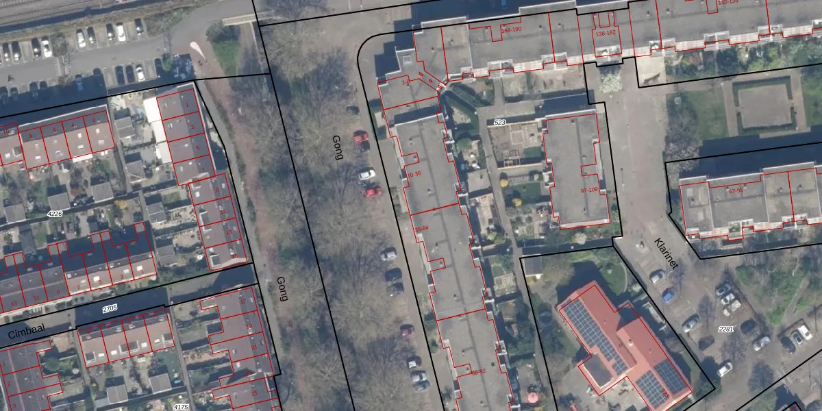 Gong 36 is gelegen op kadastraal perceel RTD13BA523. Deze kadastrale aanduiding is uniek en wordt gebruikt door het Kadaster om eigendomsrechten en andere zakelijke rechten vast te leggen. Het perceel maakt onderdeel uit van de kadastrale gemeente Rotterdam.