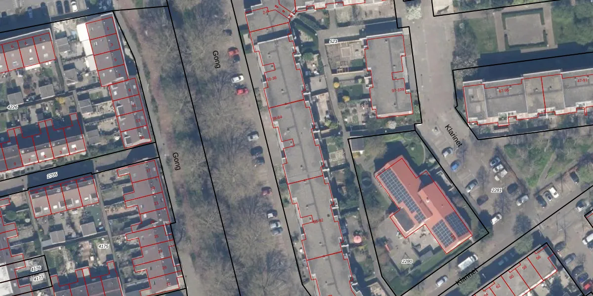 Gong 42 is gelegen op kadastraal perceel RTD13BA523. Deze kadastrale aanduiding is uniek en wordt gebruikt door het Kadaster om eigendomsrechten en andere zakelijke rechten vast te leggen. Het perceel maakt onderdeel uit van de kadastrale gemeente Rotterdam.