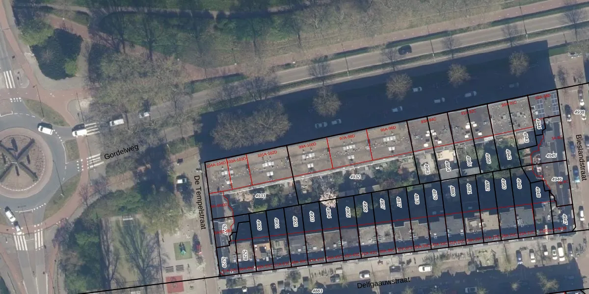 Gordelweg 100-A is gelegen op kadastraal perceel RTD09Y4932. Deze kadastrale aanduiding is uniek en wordt gebruikt door het Kadaster om eigendomsrechten en andere zakelijke rechten vast te leggen. Het perceel maakt onderdeel uit van de kadastrale gemeente Rotterdam.