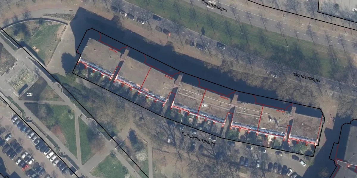 Het perceel waarop Goudsesingel 550 staat heeft een oppervlakte van 3866 m². Dit is een zeer groot perceel. De perceeloppervlakte wordt geregistreerd door het Kadaster. Gedetailleerde informatie over de maten van dit perceel kunt u vinden in het rapport Kadastrale kaart met maatvoering van Goudsesingel 550.