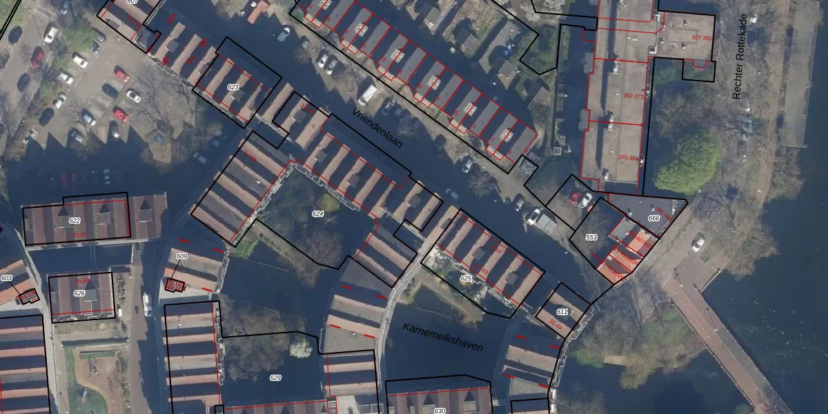Het perceel waarop het adres ligt is RTD08-AD-624. De afkorting 'RTD08' staat voor kadastrale gemeente Rotterdam. De oppervlakte van het perceel is 1437 m². Dat is groter dan gemiddeld in Rotterdam, waar de gemiddelde perceeloppervlakte op 689,2 m² ligt. Het grootste perceel in de kadastrale gemeente is 4,0 ha. Het kleinste perceel heeft een oppervlakte van 0 m². Op het perceel liggen in totaal 43 adressen. De laatste wijziging in het de Basisregistratie Kadaster (BRK) was op 10-07-2003.