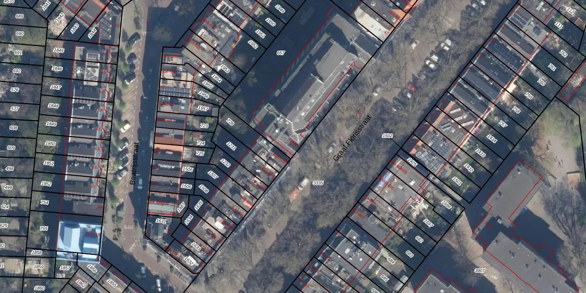 Het perceel waarop Graaf Florisstraat 51-F staat heeft een oppervlakte van 1535 m². Dit is een zeer groot perceel. De perceeloppervlakte wordt geregistreerd door het Kadaster. Gedetailleerde informatie over de maten van dit perceel kunt u vinden in het rapport Kadastrale kaart met maatvoering van Graaf Florisstraat 51-F.