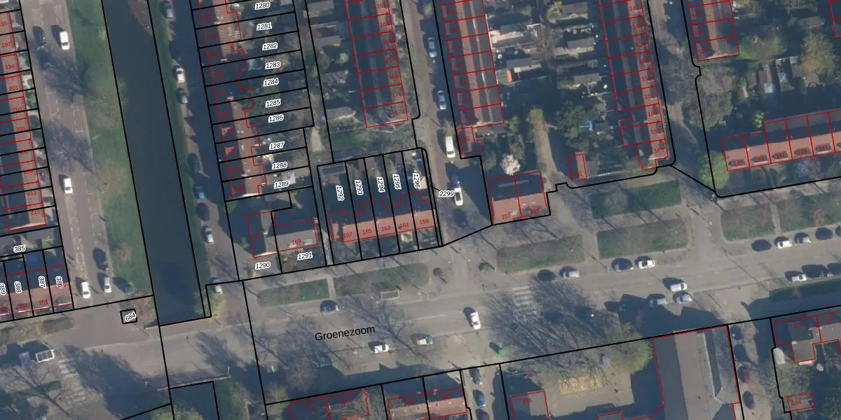 Groenezoom 159 is gelegen op kadastraal perceel RTD05V1296. Deze kadastrale aanduiding is uniek en wordt gebruikt door het Kadaster om eigendomsrechten en andere zakelijke rechten vast te leggen. Het perceel maakt onderdeel uit van de kadastrale gemeente Rotterdam.