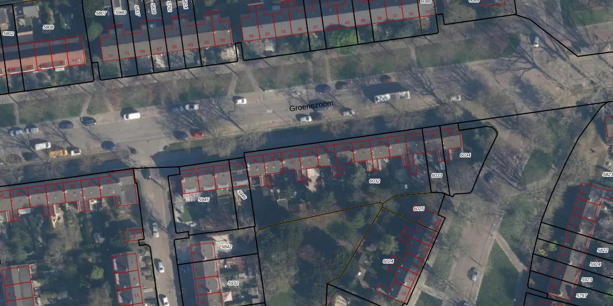 Groenezoom 62 is gelegen op kadastraal perceel RTD05V6032. Deze kadastrale aanduiding is uniek en wordt gebruikt door het Kadaster om eigendomsrechten en andere zakelijke rechten vast te leggen. Het perceel maakt onderdeel uit van de kadastrale gemeente Rotterdam.