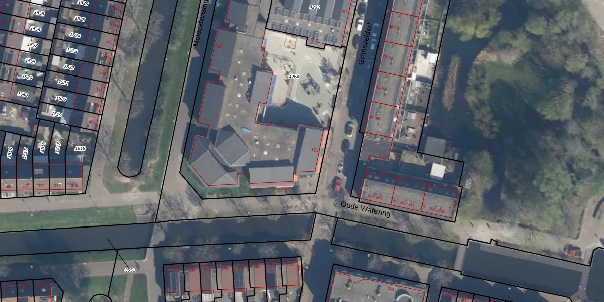 Het perceel waarop Gronsvelderf 105 staat heeft een oppervlakte van 3797 m². Dit is een zeer groot perceel. De perceeloppervlakte wordt geregistreerd door het Kadaster. Gedetailleerde informatie over de maten van dit perceel kunt u vinden in het rapport Kadastrale kaart met maatvoering van Gronsvelderf 105.
