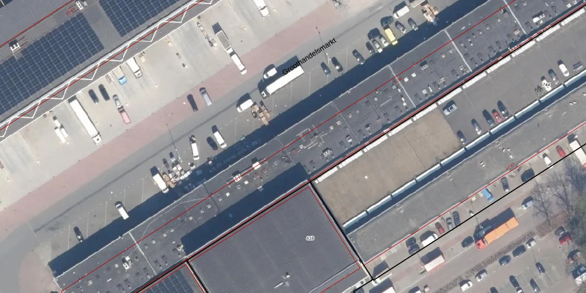 Het perceel waarop Groothandelsmarkt 13 staat heeft een oppervlakte van 7,4 ha. Dit is een zeer groot perceel. De perceeloppervlakte wordt geregistreerd door het Kadaster. Gedetailleerde informatie over de maten van dit perceel kunt u vinden in het rapport Kadastrale kaart met maatvoering van Groothandelsmarkt 13.