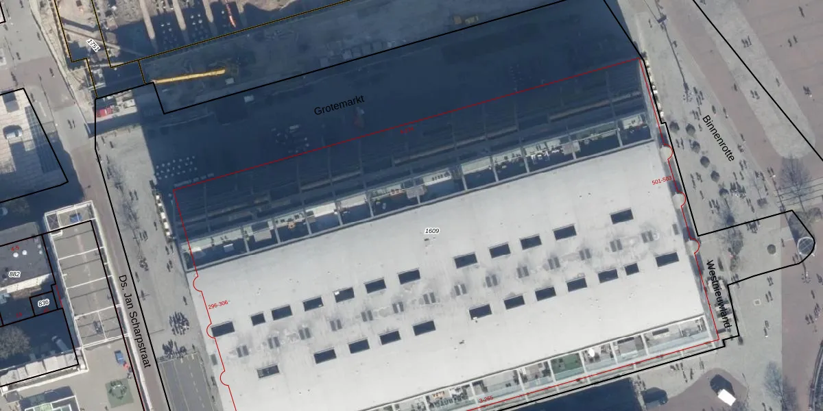 Het perceel waarop Grotemarkt 166 staat heeft een oppervlakte van 1,3 ha. Dit is een zeer groot perceel. De perceeloppervlakte wordt geregistreerd door het Kadaster. Gedetailleerde informatie over de maten van dit perceel kunt u vinden in het rapport Kadastrale kaart met maatvoering van Grotemarkt 166.