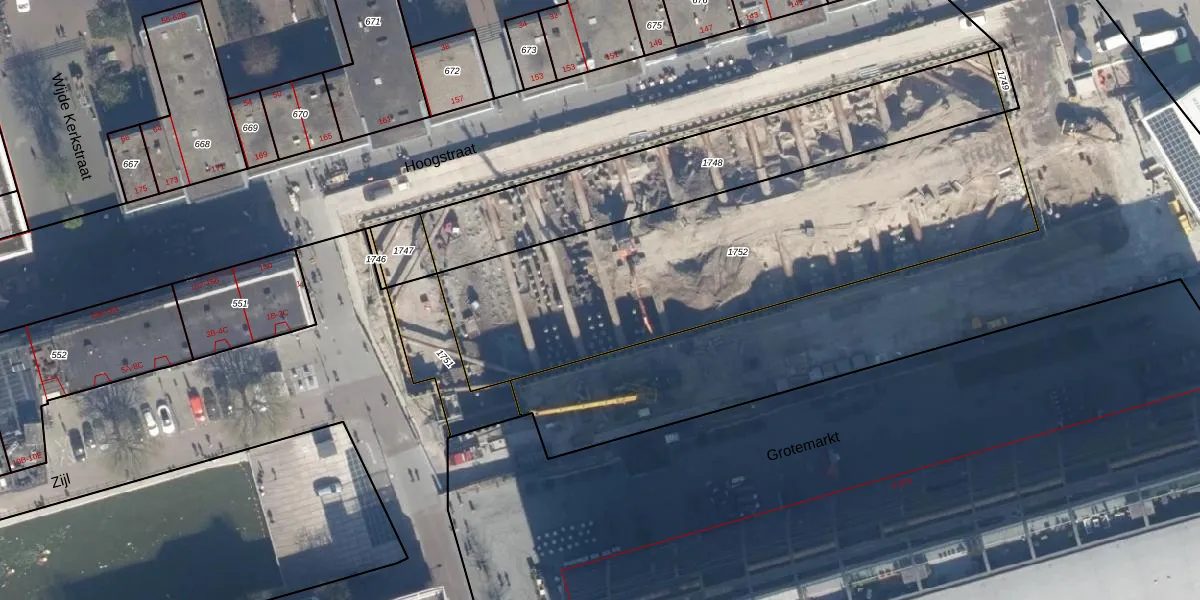 Het perceel waarop Grotemarkt 21 staat heeft een oppervlakte van 2018 m². Dit is een zeer groot perceel. De perceeloppervlakte wordt geregistreerd door het Kadaster. Gedetailleerde informatie over de maten van dit perceel kunt u vinden in het rapport Kadastrale kaart met maatvoering van Grotemarkt 21.