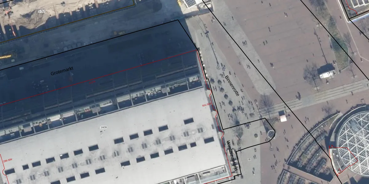 Het perceel waarop Grotemarkt 6 staat heeft een oppervlakte van 1,3 ha. Dit is een zeer groot perceel. De perceeloppervlakte wordt geregistreerd door het Kadaster. Gedetailleerde informatie over de maten van dit perceel kunt u vinden in het rapport Kadastrale kaart met maatvoering van Grotemarkt 6.