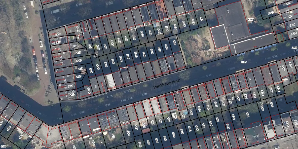 Harddraverstraat 33-B is gelegen op kadastraal perceel RTD10Z2041. Deze kadastrale aanduiding is uniek en wordt gebruikt door het Kadaster om eigendomsrechten en andere zakelijke rechten vast te leggen. Het perceel maakt onderdeel uit van de kadastrale gemeente Rotterdam.