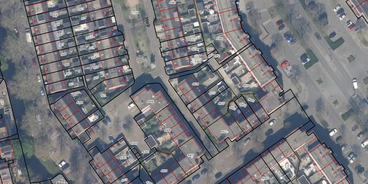 Harp 46 is gelegen op kadastraal perceel RTD13BA4414. Deze kadastrale aanduiding is uniek en wordt gebruikt door het Kadaster om eigendomsrechten en andere zakelijke rechten vast te leggen. Het perceel maakt onderdeel uit van de kadastrale gemeente Rotterdam.
