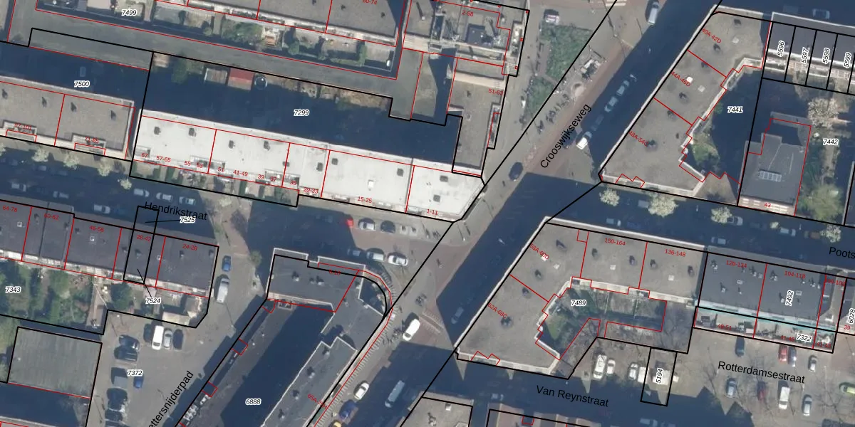 Het adres is gelegen op perceel 7299 in de sectie R en de kadastrale gemeente Rotterdam. De kadastrale aanduiding is aldus RTD07-R-7299. De oppervlakte van het perceel is 2080 m². Dat is groter dan gemiddeld in Rotterdam, waar de gemiddelde perceeloppervlakte op 506,86 m² ligt. Het kleinste perceel in de kadastrale gemeente is 0 m² groot. De grootste perceeloppervlakte is 10,8 ha. Er zijn 32 adressen aanwezig op het perceel. De huidige grenzen van het perceel zijn digitaal in de Basisregistratie Kadaster (BRK) geregistreerd op 24-07-2003.