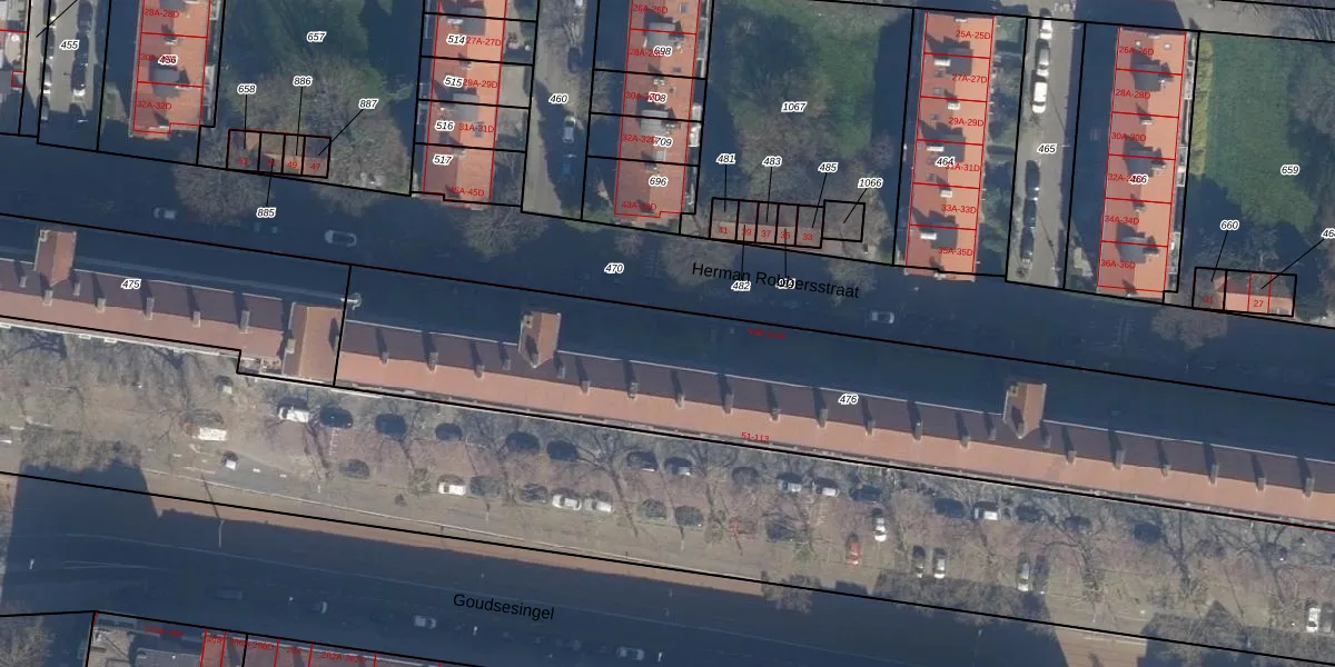 Het adres is gelegen op perceel 476 in de sectie AE en de kadastrale gemeente Rotterdam. De kadastrale aanduiding is aldus RTD04-AE-476. De gemiddelde perceeloppervlakte in de kadastrale gemeente Rotterdam is 1239,97 m². Dit perceel is met zijn 3162 m² dus groter dan gemiddeld. Het grootste perceel in de kadastrale gemeente is 17,3 ha. Het kleinste perceel heeft een oppervlakte van 0 m². Op het perceel zijn 134 adressen aanwezig. De laatste wijziging in het de Basisregistratie Kadaster (BRK) was op 20-01-2003.